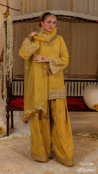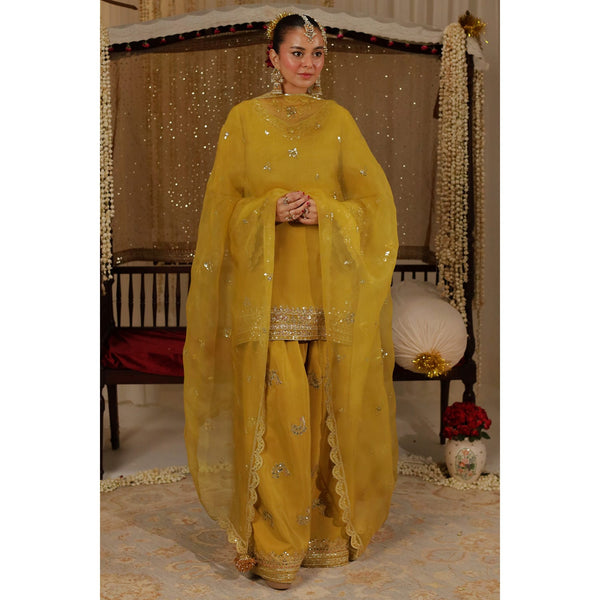 Elevate your festive look with this mustard yellow three-piece ensemble, beautifully adorned with delicate embroidery and shimmering embellishments. The straight kameez features intricate handwork along the neckline and hem, paired with a traditional farshi shalwar that exudes regal charm. A scalloped organza dupatta with fine detailing completes the outfit, making it a perfect choice for weddings and festive occasions.