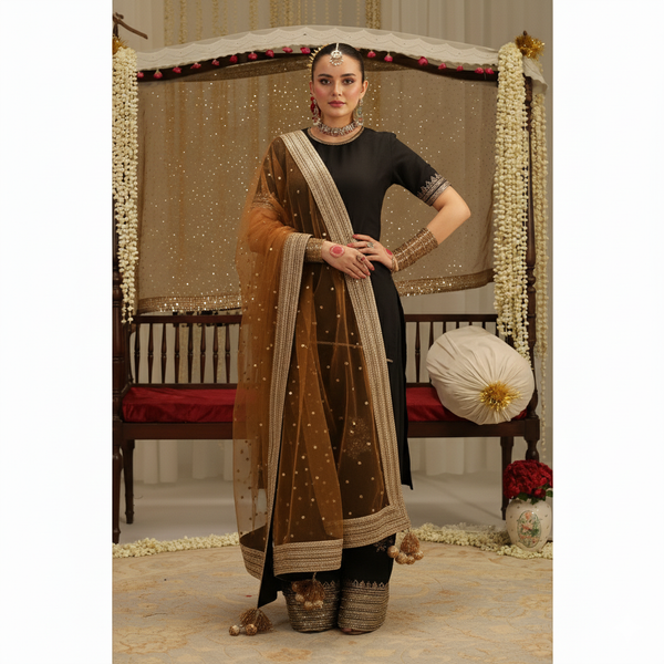 The rich black fabric is beautifully contrasted with heavy work along the cuffs and stunning floral embroidery accents on the legs. A striking amber organza dupatta completes the look, featuring scattered sequins and a substantial, multi-layered gold border. The rich colors and detailed work make this a truly regal choice for a formal event or high-end celebration.