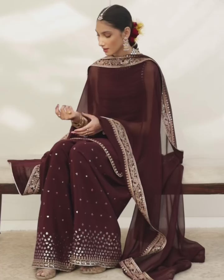 Drape yourself in elegance with Arzo – a rich burgundy 3-piece outfit that’s built to shine. The shirt features golden tilla embroidery, delicate sequin accents, and intricate mirror work that give it a regal feel from top to bottom.