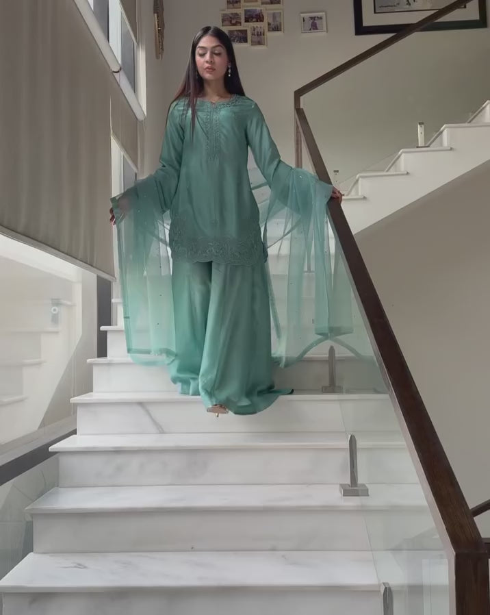 The short silk shirt features intricate embroidery on the neckline and a gracefully designed U-shape daman, adding depth and sophistication to the overall look. Paired with a stylish plazoo, it creates a flattering and contemporary silhouette. The ensemble is completed with a delicate organza dupatta adorned with exquisite mukesh work, adding a subtle shimmer and festive charm.