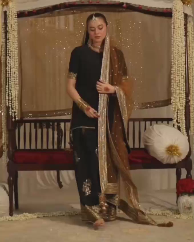 The dress comes with an Bamber organza dupatta, decorated with light sequin work and a wide gold border, which completes the look beautifully. The color contrast and detailing make it a great choice for weddings, formal events, and festive wear.